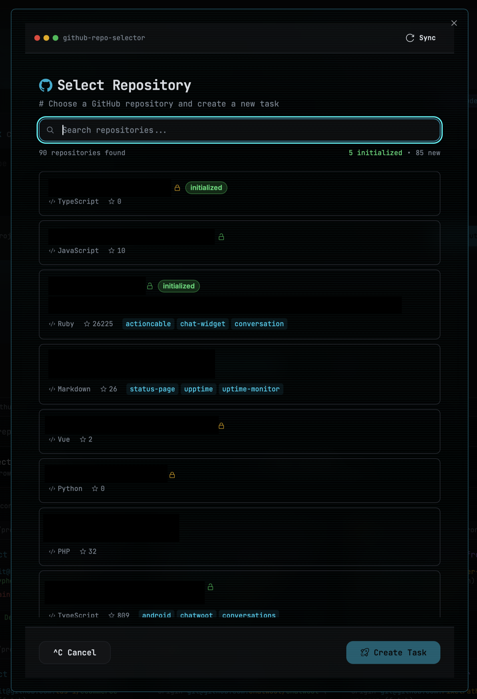 Browse and search your GitHub repositoriesSearch — Filter by name or description Sync — Refresh to see newly created repos Create Task — One click to start working Option B: Enter SSH URL manually