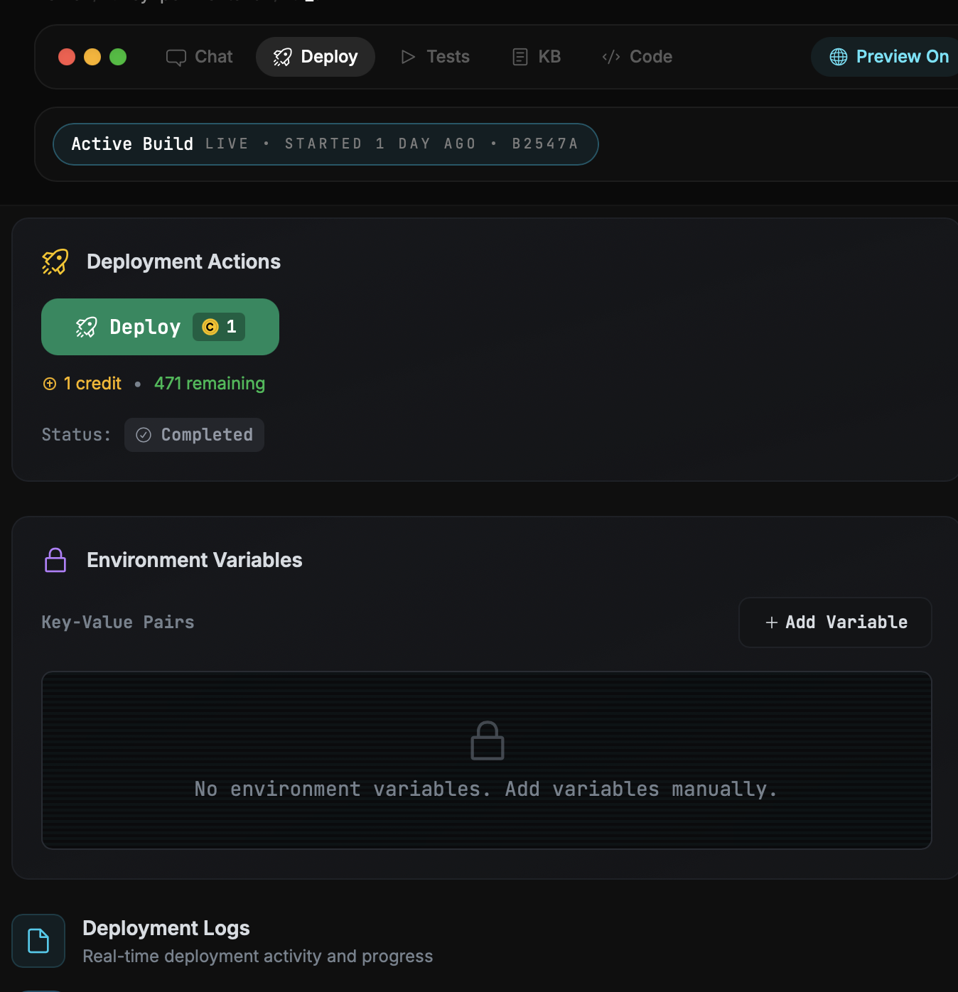 "Add a contact form to the homepage" "Fix the mobile navigation bug" "Refactor the authentication system" The AI will analyze your codebase and start working on your request.