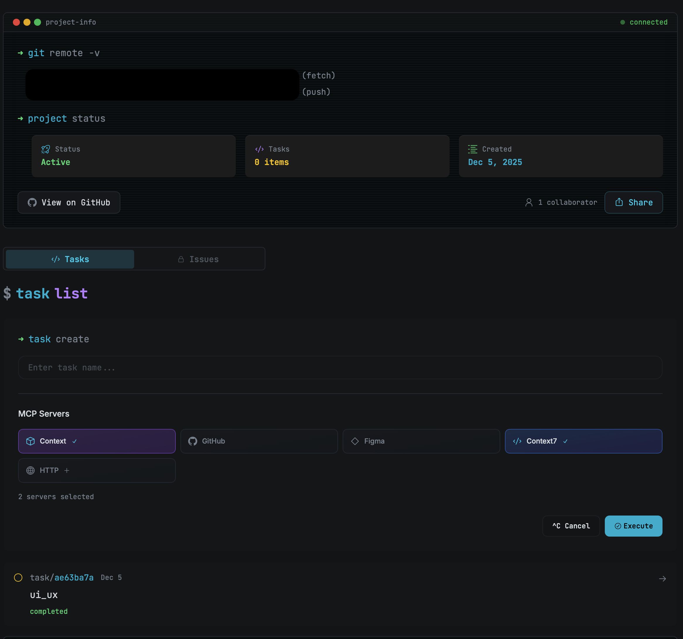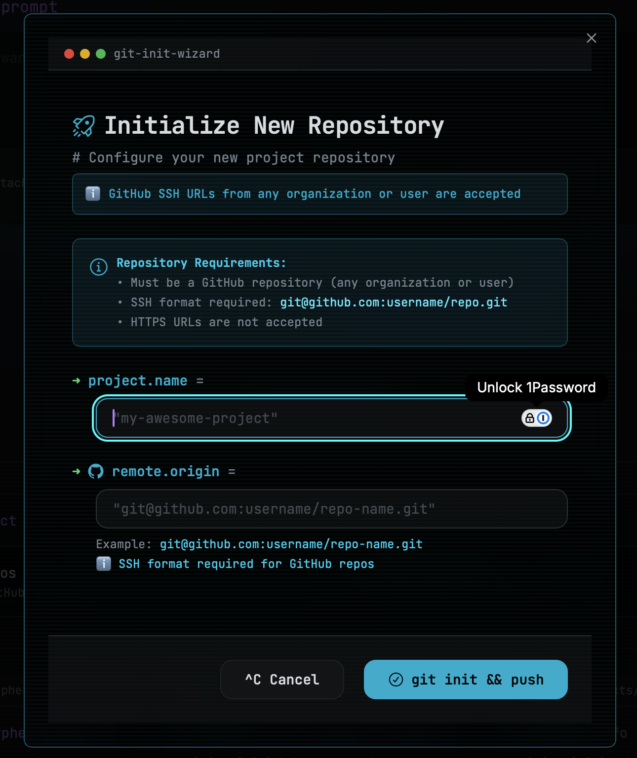 Enter repository details manuallyProject Name — Give your project a meaningful name Remote Origin — Paste the SSH URL (git@github.com:user/repo.git) git init && push — Initialize and connect to GitHub Once your repository is connected, create a new task to start working. Describe what you want to build or change: