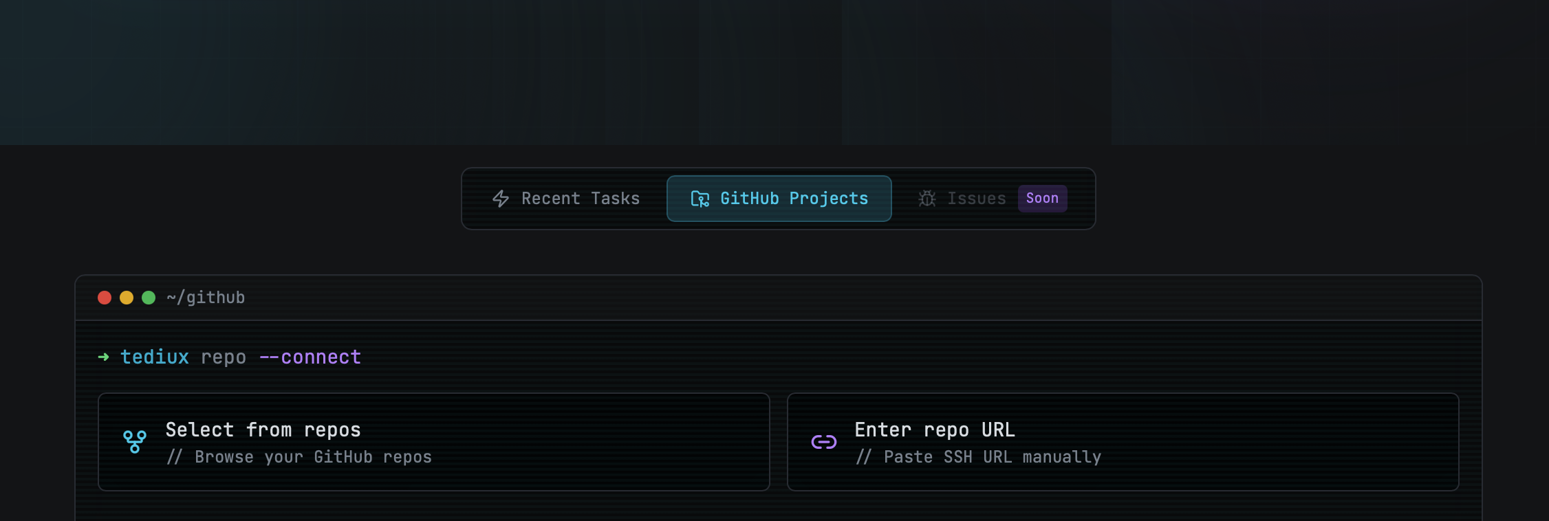 Browse and search your GitHub repositoriesSearch — Filter by name or description Sync — Refresh to see newly created repos Create Task — One click to start working Option B: Enter SSH URL manually